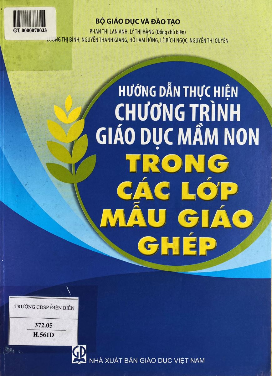 cuốn tài liệu: ”Hướng dẫn thực hiện chương trình giáo dục mầm non trong các lớp mẫu giáo ghép” của tác giả Phan Thị Lan Anh. Cuốn sách gồm 87 trang, khổ sách 19 x 27 cm. Nhà xuất bản giáo dục Việt Nam năm 2018.